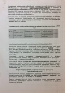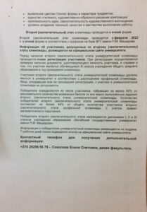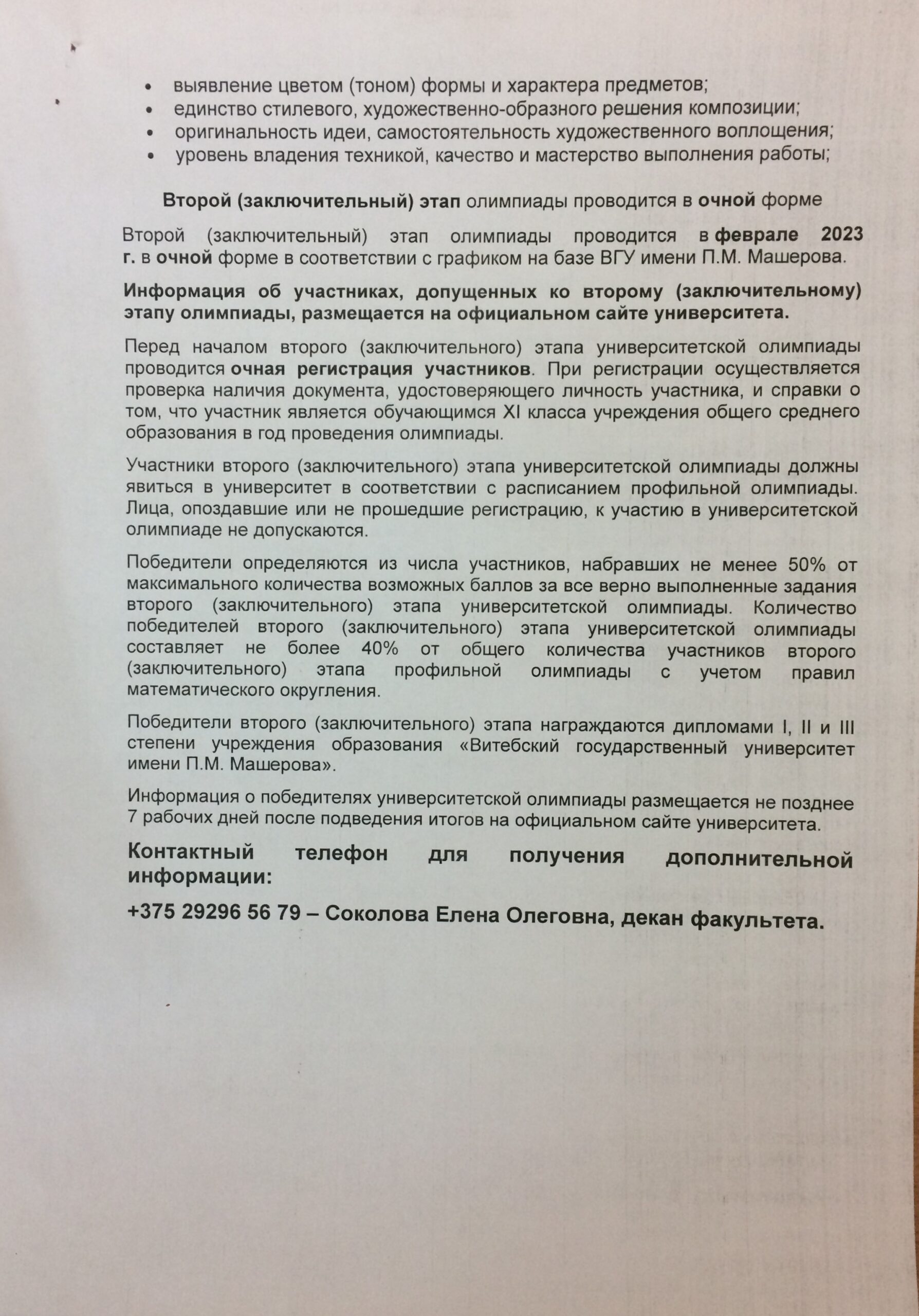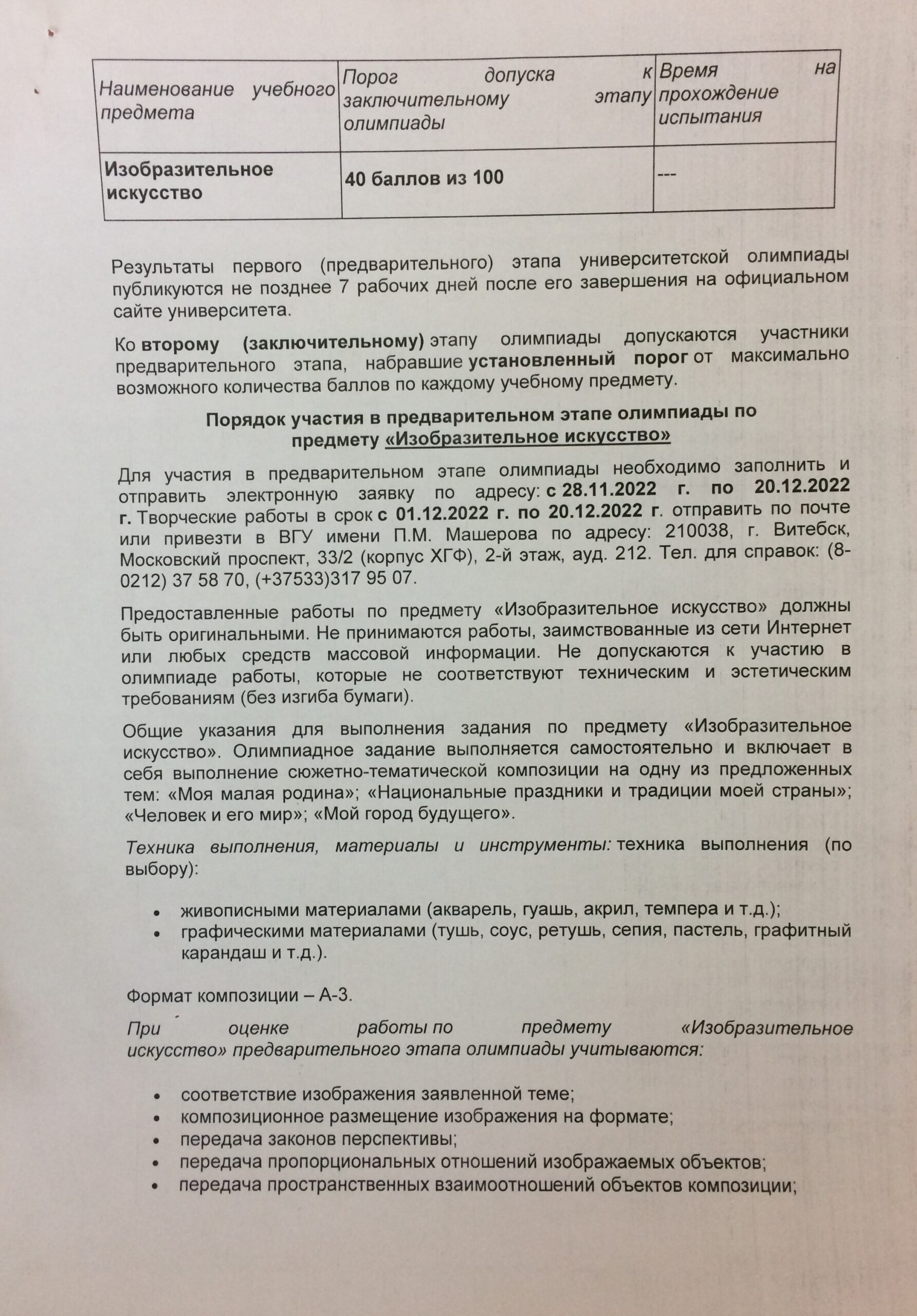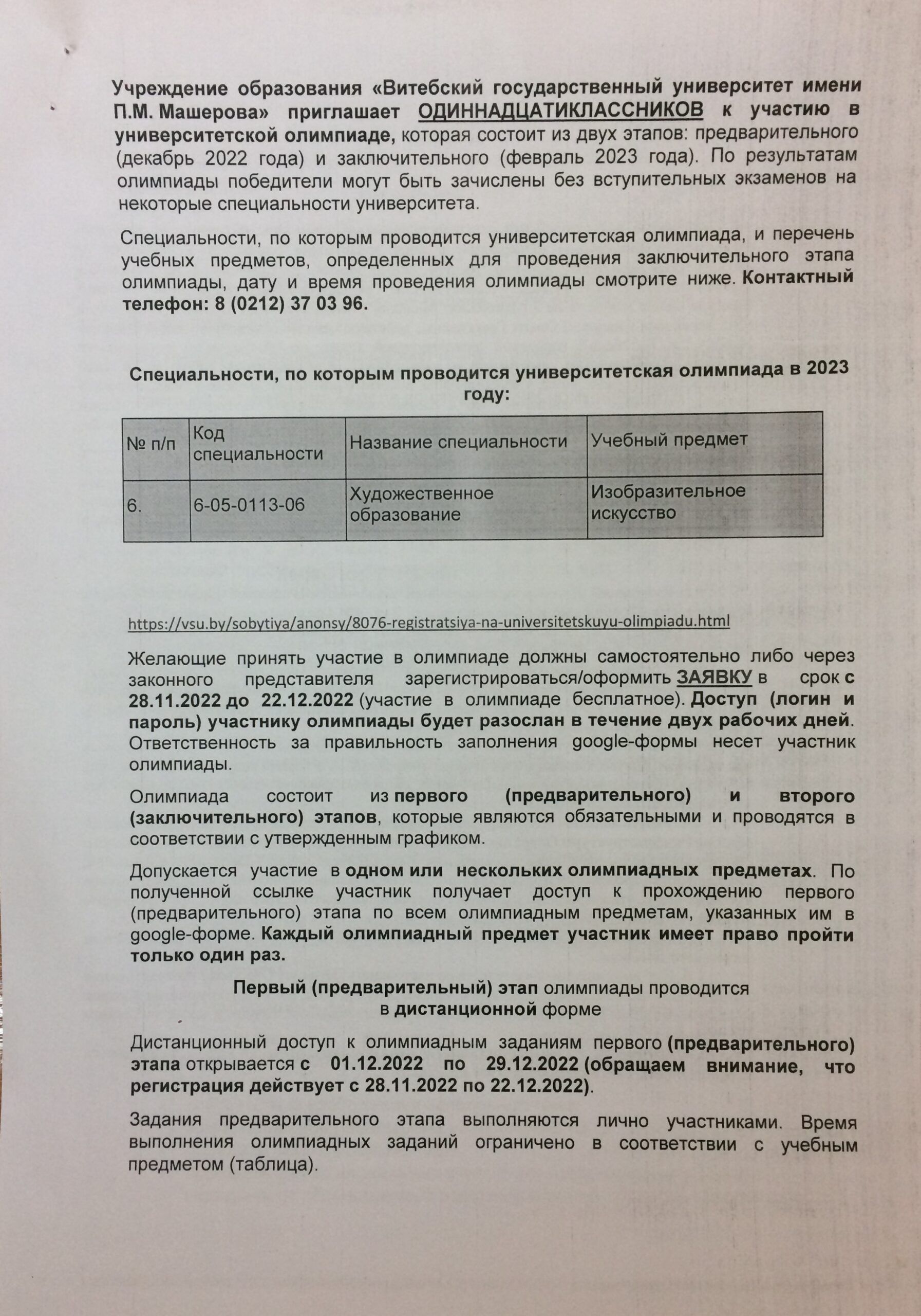 Учреждение образования «Витебский государственный университет имени П.М. Машерова» приглашает ОДИННАДЦАТИКЛАССНИКОВ к участию в университетской олимпиаде по предмету «Изобразительное искусство» (специальность «Художественное образование»). По результатам олимпиады победители могут быть зачислены в университет без вступительных экзаменов.