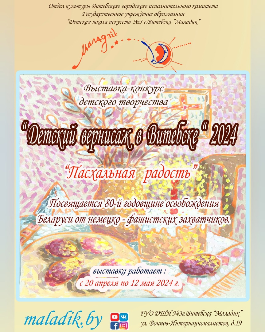В выставочных залах ГУО «Детская школа искусств № 3 г. Витебска «Маладик» (ул. Воинов-Интернационалистов, 19) проходит выставка «Пасхальная радость» в рамках Детского вернисажа в Витебске по итогам одноименного конкурса. В первых трех залах размещены художественные произведения детей на тему «Пасха». В четвертом представлены творческие работы на тему «Путь к Победе», которые посвящены 80-й годовщине освобождения Беларуси от немецко-фашистских захватчиков.